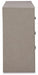 Love sleek and bold contemporary style? Drink in the beauty of this dresser with mirror. Its eye-catching details include glam glitter accents and the look of leather grain with a subtle gray finish. Large-scale linear handles, in a sophisticated champagne chrome tone, play perfectly with the streamlined aesthetic. This storage piece is a simply stunning way to achieve the bedroom of your dreams.