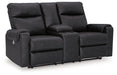 You don’t just want to recline. You want to recline in high design. This power reclining loveseat’s clean lines and supple faux leather are out to capture your heart with style and comfort. Easily tuck away remotes or gaming controllers and keep drinks close by with its handy console. This loveseat gives you the upscale look you want for less—simply take a seat, raise your legs and relax.