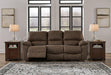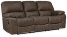 Living room lounging, with a touch of simply stunning character. This reclining sofa seamlessly complements your contemporary cozy space. Accented by jumbo stitching, the versatile chocolate faux leather is a tried-and-true approach to everyday style. And with only a simple pull needed to extend the recliner on either side, this piece proves homey, inviting design and superb comfort go hand in hand.